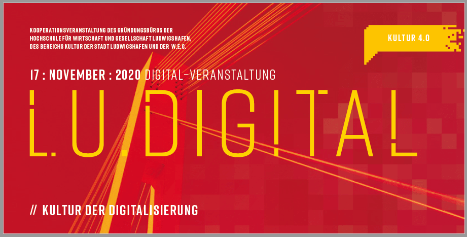 Wir wollen daher mit einer DIGITAL-Veranstaltung die “Kultur der Digitalisierung” in den Blick nehmen, die als Kooperationsveranstaltung Teil der Reihe LU.DIGITAL ist – gemeinsam präsentiert vom Gründungsbüro der Hochschule für Wirtschaft und Gesellschaft Ludwigshafen, dem Bereich Kultur der Stadt Ludwigshafen am Rhein und der W.E.G.