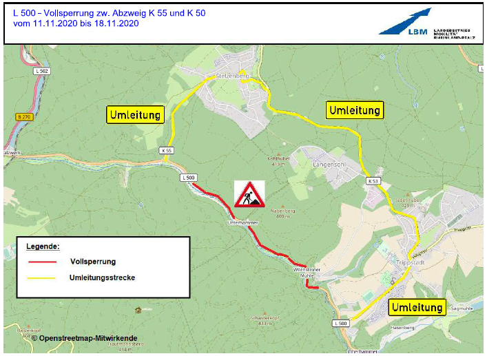 Ab dem 11. November 2020 beginnen die Straßensanierungsarbeiten entlang der L 500 zwischen der Abzweigung K 55 Stelzenberg und K 50 Trippstadt im Bereich des Unterhammers sowie der Klug´sche Mühle. Für die Bauarbeiten wird die L 500 voll gesperrt. Die Umleitung erfolgt über die K 55 – Stelzenberg – K 53 – Trippstadt und der K 50 und in gegengesetzter Richtung (s. Skizze:20-11-06_L_500_-_Vollsperrung). Die Bauarbeiten sollen bis zum 18. November 2020 abgeschlossen sein. Die Straße erhält eine Sanierungsschicht, welche auf die Asphaltdecke aufgebracht wird.