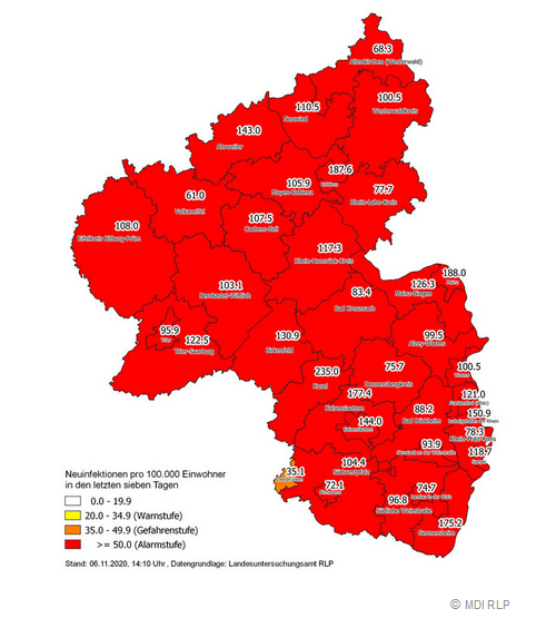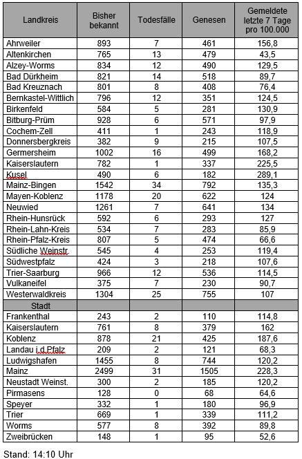 Die oben genannten Zahlen entsprechen den in der Meldesoftware des Robert Koch-Instituts übermittelten laborbestätigten Fällen einer COVID-19 Erkrankung mit Meldeadresse in Rheinland-Pfalz. Diese werden von den Gesundheitsämtern über die Landesmeldestelle beim Landesuntersuchungsamt an das Robert Koch-Institut übermittelt. Diese Zahlen können vereinzelt von den durch die Kreisverwaltungen kommunizierten Zahlen abweichen.