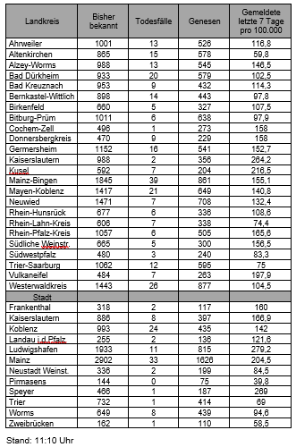 Die oben genannten Zahlen entsprechen den in der Meldesoftware des Robert Koch-Instituts übermittelten laborbestätigten Fällen einer COVID-19 Erkrankung mit Meldeadresse in Rheinland-Pfalz. Diese werden von den Gesundheitsämtern über die Landesmeldestelle beim Landesuntersuchungsamt an das Robert Koch-Institut übermittelt. Diese Zahlen können vereinzelt von den durch die Kreisverwaltungen kommunizierten Zahlen abweichen.