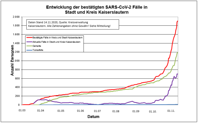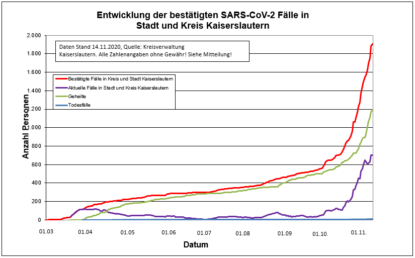 Aktuell sind damit 700 Personen mit Corona-Infektionen registriert. Insgesamt wurden bislang 1.904 Indexfälle in Stadt und Landkreis Kaiserslautern registriert. Aufgrund landeseinheitlicher RKI-Vorgaben werden die 1.193 inzwischen genesenen Personen und die mittlerweile 11 Todesfälle jedoch weiter in der Gesamtstatistik der positiven Fälle weiter mitgeführt.