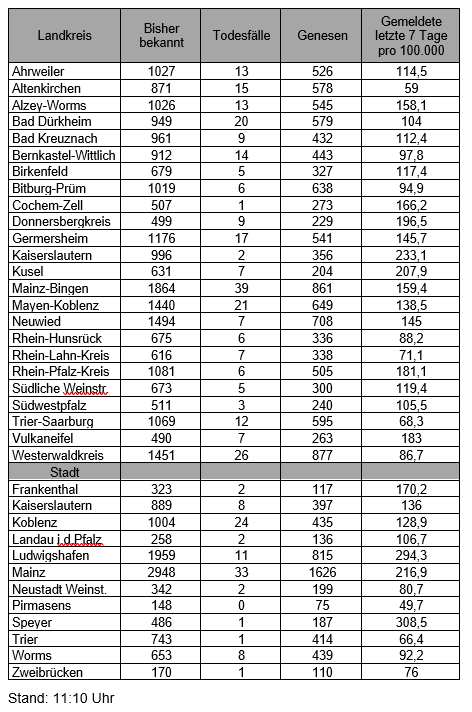 Die oben genannten Zahlen entsprechen den in der Meldesoftware des Robert Koch-Instituts übermittelten laborbestätigten Fällen einer COVID-19 Erkrankung mit Meldeadresse in Rheinland-Pfalz. Diese werden von den Gesundheitsämtern über die Landesmeldestelle beim Landesuntersuchungsamt an das Robert Koch-Institut übermittelt. Diese Zahlen können vereinzelt von den durch die Kreisverwaltungen kommunizierten Zahlen abweichen.