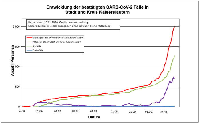 Heute wurden zwei weitere Todesfälle aus der Stadt Kaiserslautern bestätigt. Das Labor meldete 35 neue Indexfälle (14 x Stadt, 15 LK KL, 6x Streitkräfte). 84 Personen (27 Stadt KL, 46 Landkreis KL, 1 Streitkräfte) konnten aus der Quarantäne entlassen werden.