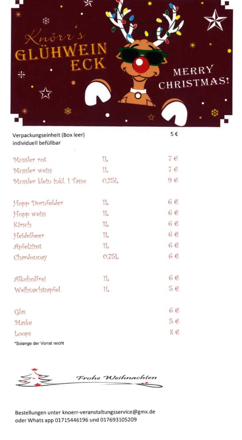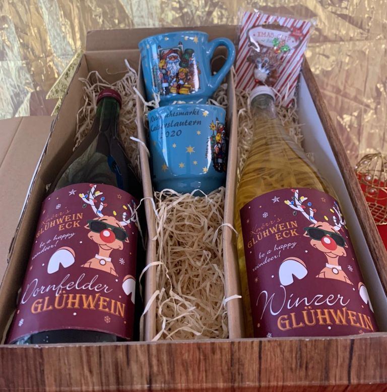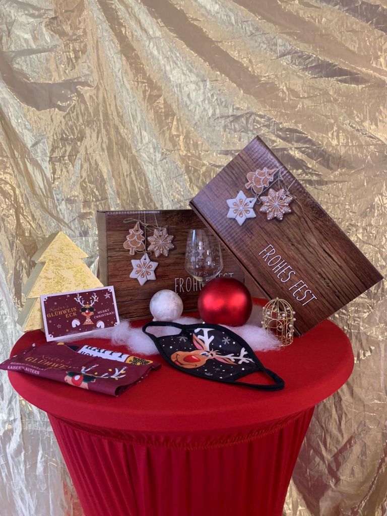 Wir verkaufen wie jedes Jahr unsere Weihnachtstassen (dieses Jahr nur in geringeren Mengen verfügbar) und unsere Glühweine in Flaschen um ihn zu Hause genießen zu können. Als nette Geschenkidee und hübsch verpackt, aber auch für den Eigenverbrauch gedacht…:-).