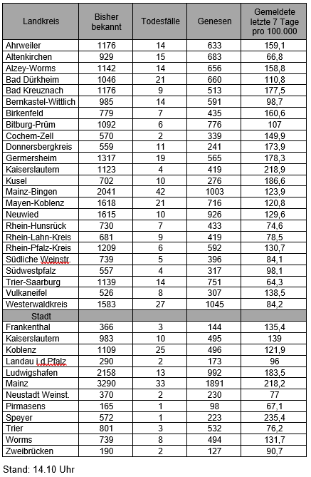 Die oben genannten Zahlen entsprechen den in der Meldesoftware des Robert Koch-Instituts übermittelten laborbestätigten Fällen einer COVID-19 Erkrankung mit Meldeadresse in Rheinland-Pfalz. Diese werden von den Gesundheitsämtern über die Landesmeldestelle beim Landesuntersuchungsamt an das Robert Koch-Institut übermittelt. Diese Zahlen können vereinzelt von den durch die Kreisverwaltungen kommunizierten Zahlen abweichen.