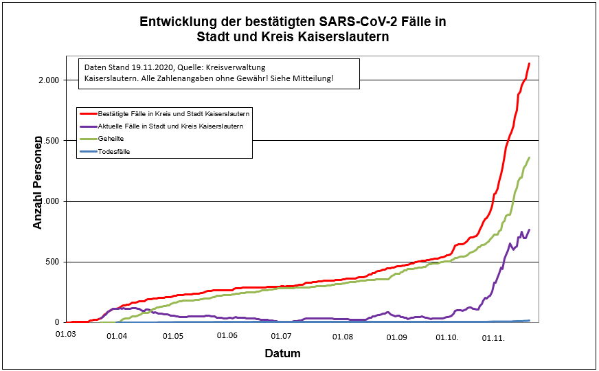 Heute sind zwei Todesfälle (Stadt KL und Landkreis KL ) zu vermelden. Das Labor bestätigte 69 neue Indexfälle (26 x Stadt, 43 x LK KL).