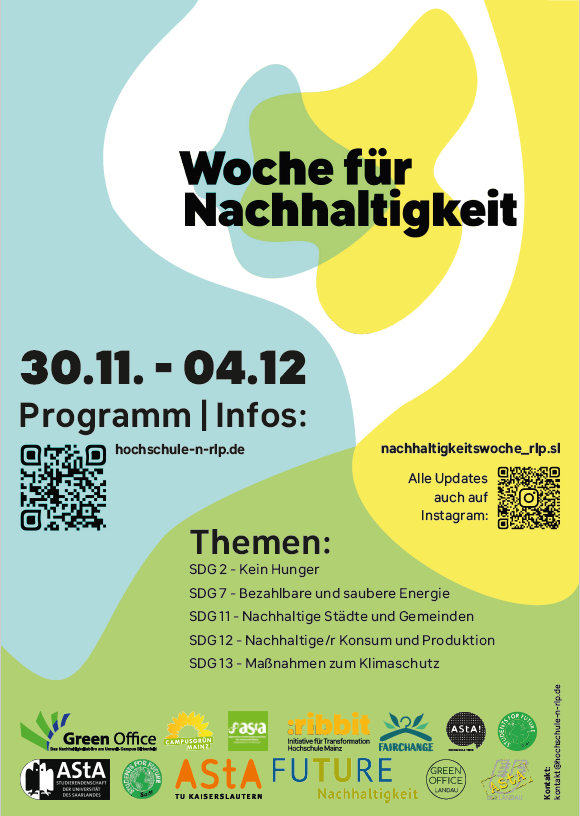 Vom 30.11.2020 bis zum 04.12.2020 findet die digitale Nachhaltigkeitswoche an Hochschulen in Rheinland-Pfalz und dem Saarland statt, zu der alle Interessierten herzlich eingeladen sind. Organisiert und durchgeführt wird die Veranstaltung durch ein breites Bündnis von studentischen Nachhaltigkeitsinitiativen. Aus Kaiserslautern beteiligte sich die Hochschulgruppe FUTURE Nachhaltigkeit mit Unterstützung des AStA Referates Nachhaltigkeit der TUK an der standortübergreifenden Planung.