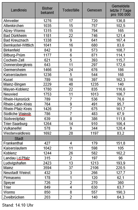 Die oben genannten Zahlen entsprechen den in der Meldesoftware des Robert Koch-Instituts übermittelten laborbestätigten Fällen einer COVID-19 Erkrankung mit Meldeadresse in Rheinland-Pfalz. Diese werden von den Gesundheitsämtern über die Landesmeldestelle beim Landesuntersuchungsamt an das Robert Koch-Institut übermittelt. Diese Zahlen können vereinzelt von den durch die Kreisverwaltungen kommunizierten Zahlen abweichen.