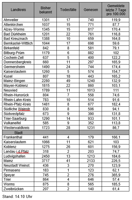 Die oben genannten Zahlen entsprechen den in der Meldesoftware des Robert Koch-Instituts übermittelten laborbestätigten Fällen einer COVID-19 Erkrankung mit Meldeadresse in Rheinland-Pfalz. Diese werden von den Gesundheitsämtern über die Landesmeldestelle beim Landesuntersuchungsamt an das Robert Koch-Institut übermittelt. Diese Zahlen können vereinzelt von den durch die Kreisverwaltungen kommunizierten Zahlen abweichen.