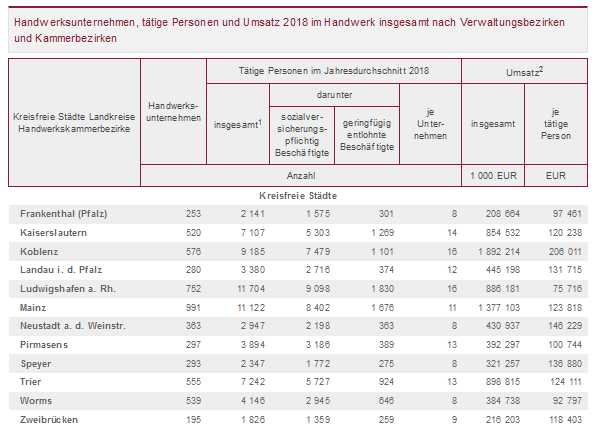 Im Jahr 2018 waren in Rheinland-Pfalz im zulassungspflichtigen und zulassungsfreien Handwerk 27.800 Unternehmen tätig; das waren 17 Prozent aller rheinland-pfälzischen Unternehmen. Wie das Statistische Landesamt Rheinland-Pfalz auf Basis der registergestützten Handwerkszählung mitteilt, erwirtschafteten diese Unternehmen 28,9 Milliarden Euro Umsatz.