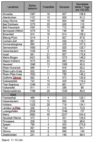 Die oben genannten Zahlen entsprechen den in der Meldesoftware des Robert Koch-Instituts übermittelten laborbestätigten Fällen einer COVID-19 Erkrankung mit Meldeadresse in Rheinland-Pfalz. Diese werden von den Gesundheitsämtern über die Landesmeldestelle beim Landesuntersuchungsamt an das Robert Koch-Institut übermittelt. Diese Zahlen können vereinzelt von den durch die Kreisverwaltungen kommunizierten Zahlen abweichen.