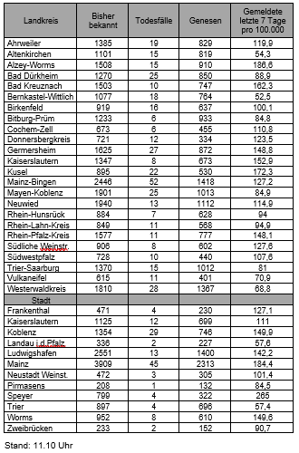 Die oben genannten Zahlen entsprechen den in der Meldesoftware des Robert Koch-Instituts übermittelten laborbestätigten Fällen einer COVID-19 Erkrankung mit Meldeadresse in Rheinland-Pfalz. Diese werden von den Gesundheitsämtern über die Landesmeldestelle beim Landesuntersuchungsamt an das Robert Koch-Institut übermittelt. Diese Zahlen können vereinzelt von den durch die Kreisverwaltungen kommunizierten Zahlen abweichen.