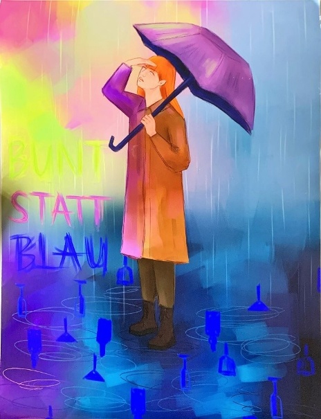 Thalia Bender spielt in ihrem Bild stark mit den Farben und regt an, sich bewusst gegen den blauen Regen, der sinnbildlich für den Alkoholkonsum steht und auf die bunte Seite zu stellen. „Als Inspiration diente hauptsächlich das Motto „bunt statt blau“, recht wortwörtlich. Die Farbe Blau assoziiert man nicht nur mit dem betrunkenen Zustand, sondern, vor allem, wenn sie dunkel ist, auch mit einem eher trostloseren Gefühl.“, sagte Thalia Bender zu ihrem Plakat. Der Kontrast sei das Bunte und das bewusste Abwenden von Alkohol indem man sich davor schützt.