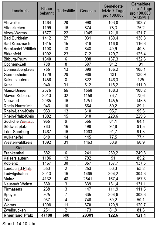 Aktuell gibt es in Rheinland-Pfalz insgesamt 47.108 bestätigte SARS-CoV-2 Fälle, 608 Todesfälle und 29.301 genesene Fälle. 17.199 Menschen im Land sind aktuell mit dem Coronavirus infiziert, Stand: 14.10 Uhr
