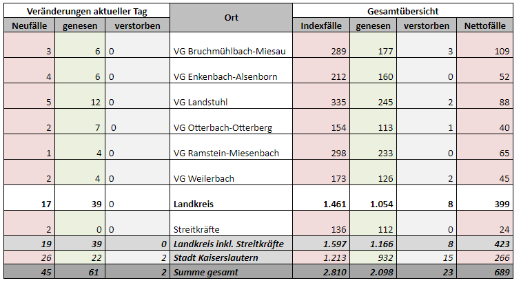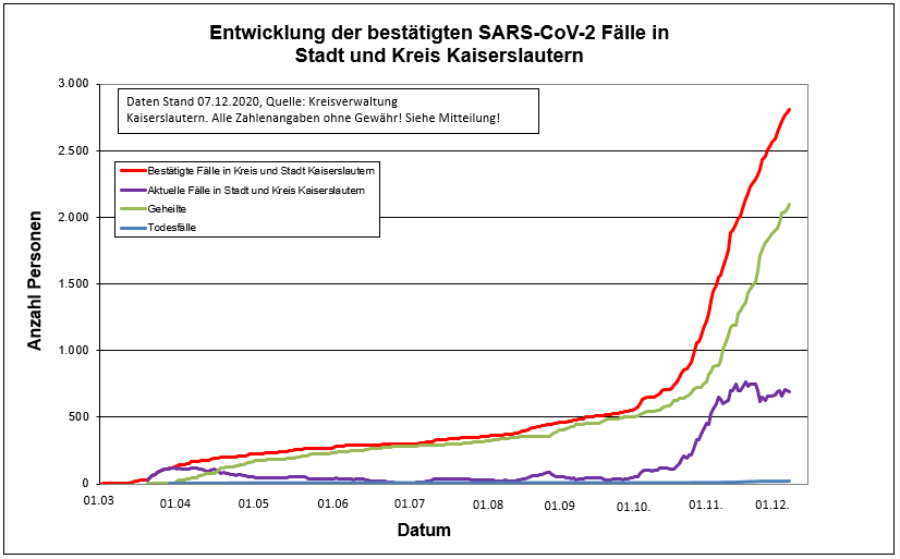 Heute wurden 2 Todesfälle aus der Stadt Kaiserslautern gemeldet. Die aktuellen Corona-Zahlen für die Stadt und den Landkreis Kaiserslautern können Sie dieser Tagesstatistik entnehmen: