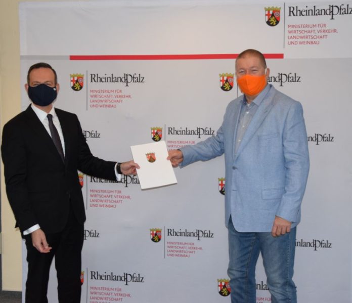 Das Wirtschaftsministerium wird Fördermitglied in der Fahrzeug-Initiative Rheinland-Pfalz e.V und unterstützt damit die kleinen und mittleren Unternehmen (KMU) der Automobilzulieferindustrie im Land. Wirtschaftsminister Dr. Volker Wissing hob bei der Übergabe des Antrags an den Vorsitzenden des Vorstands der Initiative, Andreas Seydell, die wichtige Rolle des Vereins für die Transformation der Branche hervor.