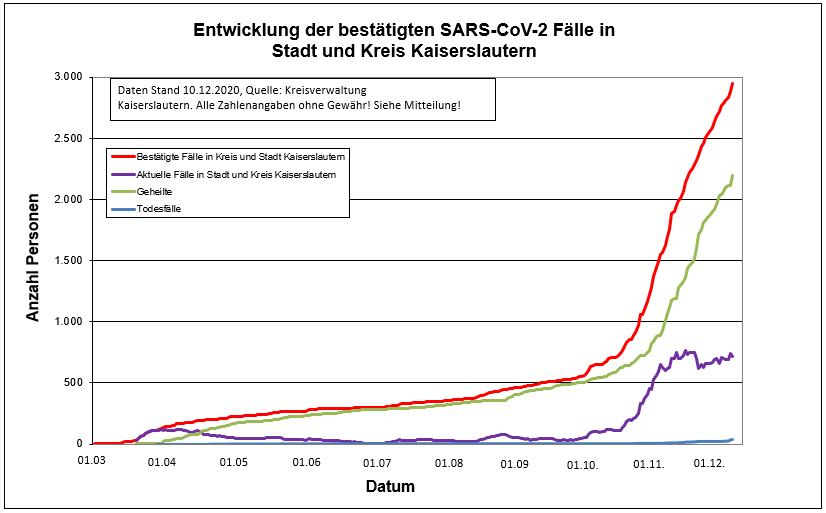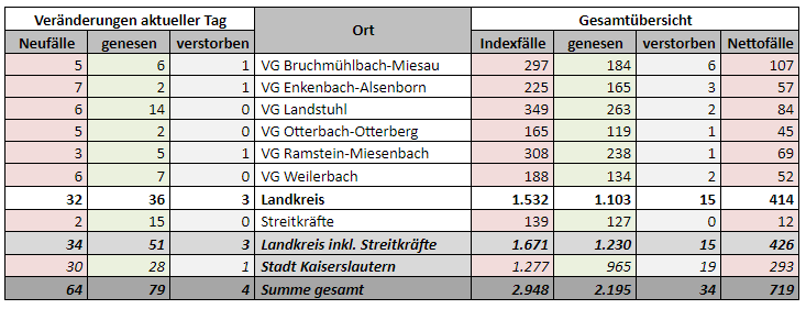 Heute sind 4 weitere Todesfälle zu vermelden. Die aktuellen Corona-Zahlen für die Stadt und den Landkreis Kaiserslautern können Sie dieser Tagesstatistik entnehmen: