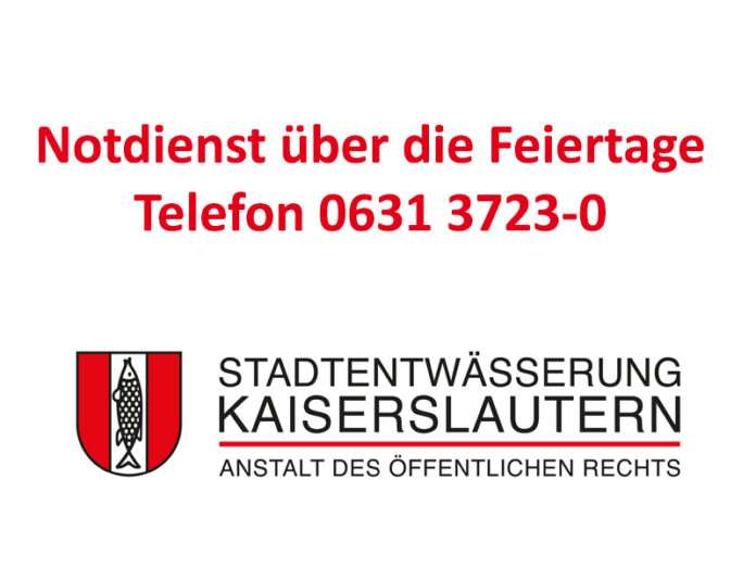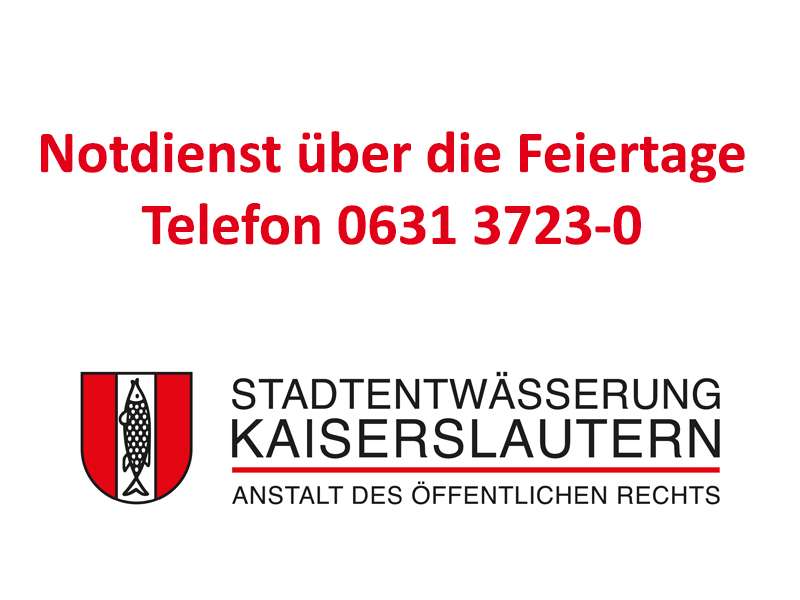 Die Stadtentwässerung Kaiserslautern AöR ist von Donnerstag, 24. Dezember 2020, bis einschließlich Sonntag, 3. Januar 2021, geschlossen. In dringenden Fällen ist der 24-Stunden-Notdienst unter der Telefon-Nummer 0631-3723-0 erreichbar.