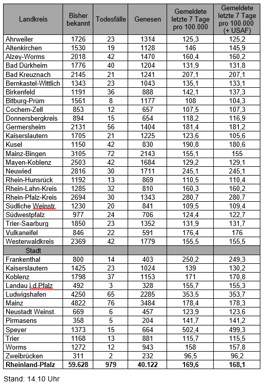 Die oben genannten Zahlen entsprechen den in der Meldesoftware des Robert Koch-Instituts übermittelten laborbestätigten Fällen einer COVID-19 Erkrankung mit Meldeadresse in Rheinland-Pfalz. Diese werden von den Gesundheitsämtern über die Landesmeldestelle beim Landesuntersuchungsamt an das Robert Koch-Institut übermittelt. Diese Zahlen können vereinzelt von den durch die Kreisverwaltungen kommunizierten Zahlen abweichen,