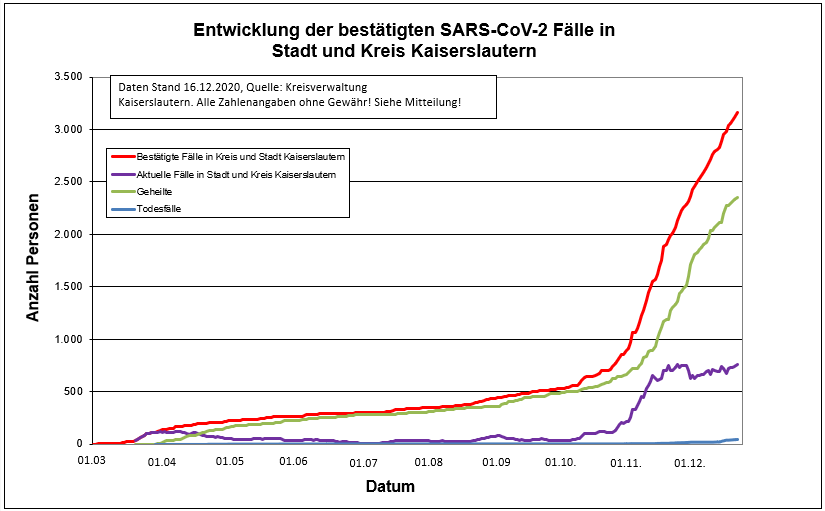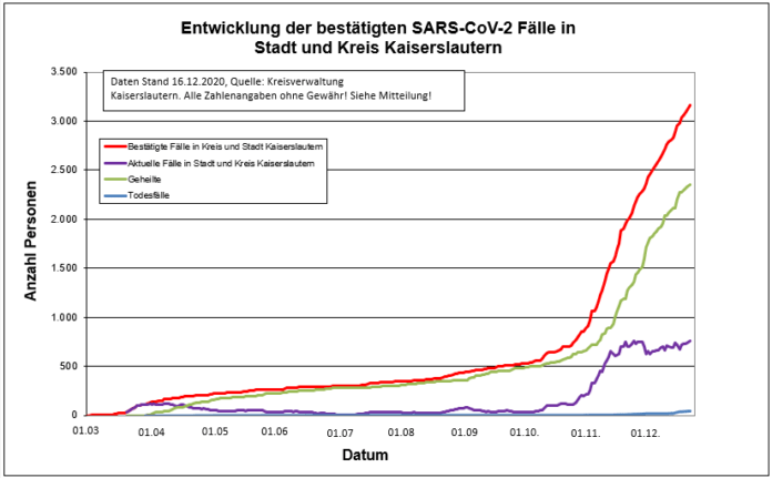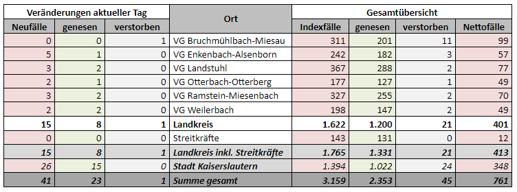 Heute ist ein weiterer Todesfall aus dem Landkreis zu vermelden. Die aktuellen Corona-Zahlen für die Stadt und den Landkreis Kaiserslautern können Sie dieser Tagesstatistik entnehmen: