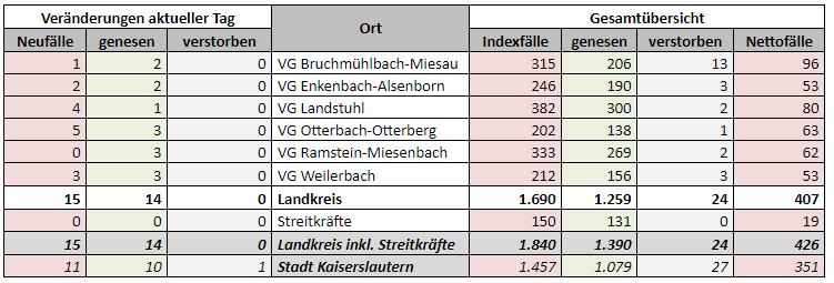 Die aktuellen Corona-Zahlen für die Stadt und den Landkreis Kaiserslautern können Sie dieser Tagesstatistik entnehmen: