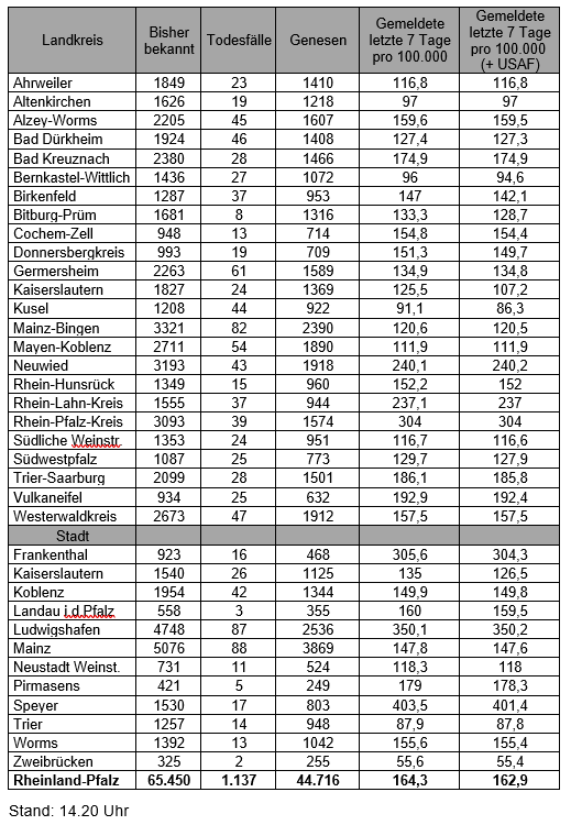 Die oben genannten Zahlen entsprechen den in der Meldesoftware des Robert Koch-Instituts übermittelten laborbestätigten Fällen einer COVID-19 Erkrankung mit Meldeadresse in Rheinland-Pfalz. Diese werden von den Gesundheitsämtern über die Landesmeldestelle beim Landesuntersuchungsamt an das Robert Koch-Institut übermittelt. Diese Zahlen können vereinzelt von den durch die Kreisverwaltungen kommunizierten Zahlen abweichen.