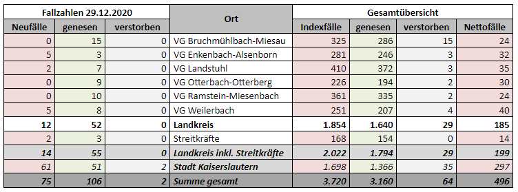 3.720 Indexfälle in Stadt und Landkreis, 3.160 genesenen Personen, 64 Todesfälle, 29.12.2020