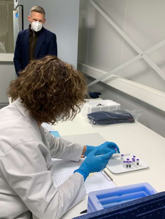 „Ich bin froh, dass wir heute endlich mit den ersten Impfungen starten können, denn jeder Tag zählt“, betonte Landrat Ralf Leßmeister, der den ersten Einsatz des Impfteams begleitete.