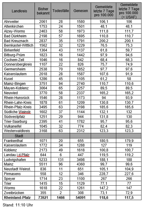 Die oben genannten Zahlen entsprechen den in der Meldesoftware des Robert Koch-Instituts übermittelten laborbestätigten Fällen einer COVID-19 Erkrankung mit Meldeadresse in Rheinland-Pfalz. Diese werden von den Gesundheitsämtern über die Landesmeldestelle beim Landesuntersuchungsamt an das Robert Koch-Institut übermittelt. Diese Zahlen können vereinzelt von den durch die Kreisverwaltungen kommunizierten Zahlen abweichen.