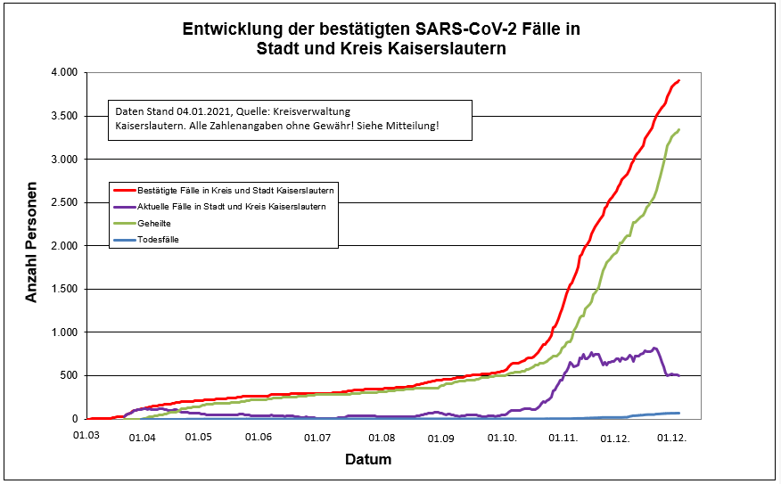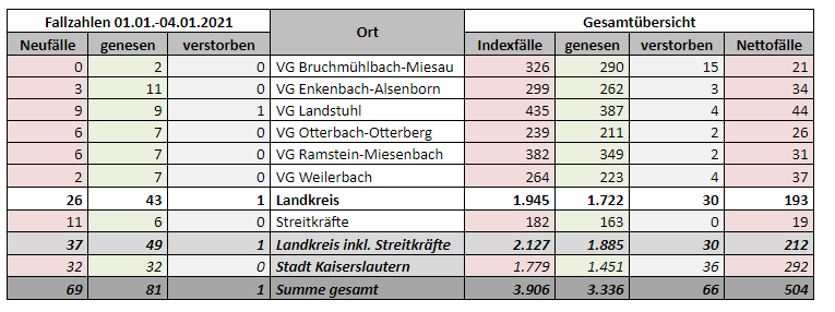 Aus dem Landkreis Kaiserslautern ist ein Todesfall zu melden. Die Fallzahlen für den Zeitraum 01. bis 04.01.2021 können Sie dieser Statistik entnehmen.
