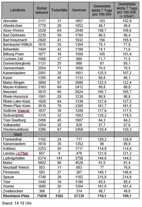 Die oben genannten Zahlen entsprechen den in der Meldesoftware des Robert Koch-Instituts übermittelten laborbestätigten Fällen einer COVID-19 Erkrankung mit Meldeadresse in Rheinland-Pfalz. Diese werden von den Gesundheitsämtern über die Landesmeldestelle beim Landesuntersuchungsamt an das Robert Koch-Institut übermittelt. Diese Zahlen können vereinzelt von den durch die Kreisverwaltungen kommunizierten Zahlen abweichen.