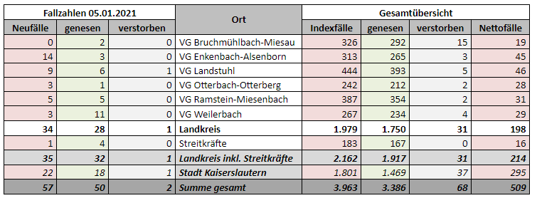 3.963 Indexfälle in Stadt und Landkreis, 3.386 genesenen Personen, 68 Todesfälle, 05.01.2021