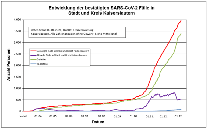 Aus Landkreis und Stadt Kaiserslautern ist je ein Todesfall zu melden. Die Fallzahlen können Sie dieser Statistik entnehmen.