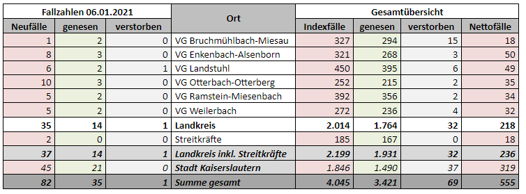 4.045 Indexfälle in Stadt und Landkreis, 3.421 genesenen Personen, 69 Todesfälle, 06.01.2021