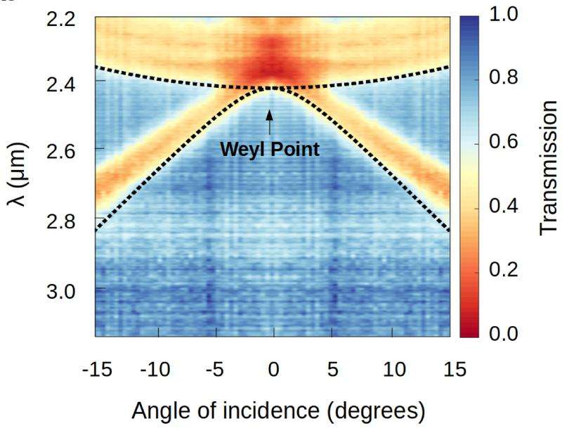 Bei topologischen Isolatoren verhält es sich anders. Hier können die Signale über die Oberfläche verlustfrei um die innenliegenden Störstellen herum fließen. „Die besonderen Zustände, die die Umleitung ermöglichen, sind immer an ganz bestimmten Punkten in der Bandstruktur – der Straßenkarte, die beschreibt wie die Signale fließen können – aufgehängt“, erläutert Jörg weiter. „Es handelt sich dabei um Stellen, an denen sich zwei Bänder berühren. Diese Stellen heißen Weyl-Punkte. Topologische Weyl-Punkte sind äußerst robust und unempfindlich gegen äußerliche Einflüsse. In optischen Materialien waren Weyl-Punkte bislang nur schwer experimentell zugänglich, weil es, um diese frei zu beobachten, einen möglichst hohen Materialkontrast braucht.“