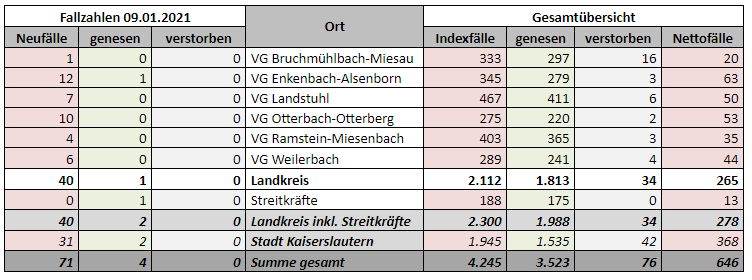 4.245 Indexfälle in Stadt und Landkreis, 3.523 genesenen Personen, 76 Todesfälle, 09.01.2021.