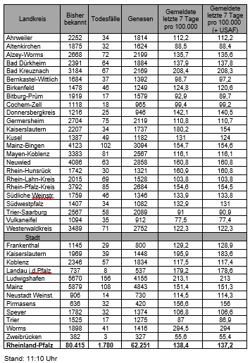 Die oben genannten Zahlen entsprechen den in der Meldesoftware des Robert Koch-Instituts übermittelten laborbestätigten Fällen einer COVID-19 Erkrankung mit Meldeadresse in Rheinland-Pfalz. Diese werden von den Gesundheitsämtern über die Landesmeldestelle beim Landesuntersuchungsamt an das Robert Koch-Institut übermittelt. Diese Zahlen können vereinzelt von den durch die Kreisverwaltungen kommunizierten Zahlen abweichen.