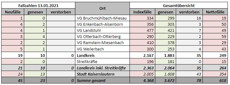 4.368 Indexfälle in Stadt und Landkreis, 3.672 genesenen Personen, 78 Todesfälle, 13.01.2021