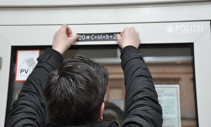 Zum Abschluss des Besuches hat Pfarrer Andreas Keller den Segensaufkleber angebracht. Traditionell steht nun die Segensbitte am Haupteingang des Präsidiums in der Logenstraße: „20*C+M+B+21“. |elz