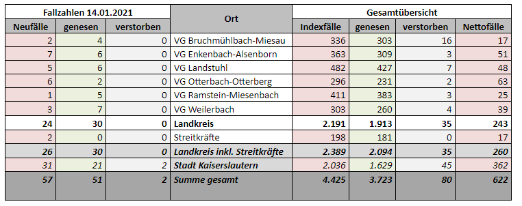 4.425 Indexfälle in Stadt und Landkreis, 3.723 genesenen Personen, 80 Todesfälle, 14.01.2021. Die Corona-Zahlen für die Stadt und den Landkreis Kaiserslautern können Sie dieser Statistik entnehmen: