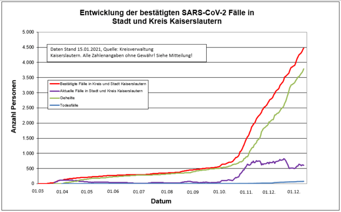 Aus der Stadt Kaiserslautern sind zwei weitere Todesfälle zu melden. Die Corona-Zahlen für die Stadt und den Landkreis Kaiserslautern können Sie dieser Statistik entnehmen: Heute wurden im Landesimpfzentrum Kaiserslautern insgesamt 402 Impfungen durchgeführt.