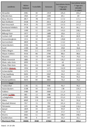 Die oben genannten Zahlen entsprechen den in der Meldesoftware des Robert Koch-Instituts übermittelten laborbestätigten Fällen einer COVID-19 Erkrankung mit Meldeadresse in Rheinland-Pfalz. Diese werden von den Gesundheitsämtern über die Landesmeldestelle beim Landesuntersuchungsamt an das Robert Koch-Institut übermittelt. Diese Zahlen können vereinzelt von den durch die Kreisverwaltungen kommunizierten Zahlen abweichen.