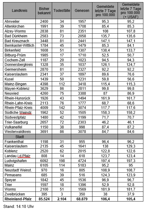 Die oben genannten Zahlen entsprechen den in der Meldesoftware des Robert Koch-Instituts übermittelten laborbestätigten Fällen einer COVID-19 Erkrankung mit Meldeadresse in Rheinland-Pfalz. Diese werden von den Gesundheitsämtern über die Landesmeldestelle beim Landesuntersuchungsamt an das Robert Koch-Institut übermittelt. Diese Zahlen können vereinzelt von den durch die Kreisverwaltungen kommunizierten Zahlen abweichen.