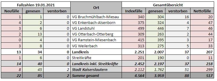 4.564 Indexfälle in Stadt und Landkreis, 3.959 genesenen Personen, 88 Todesfälle, 19.01.2021