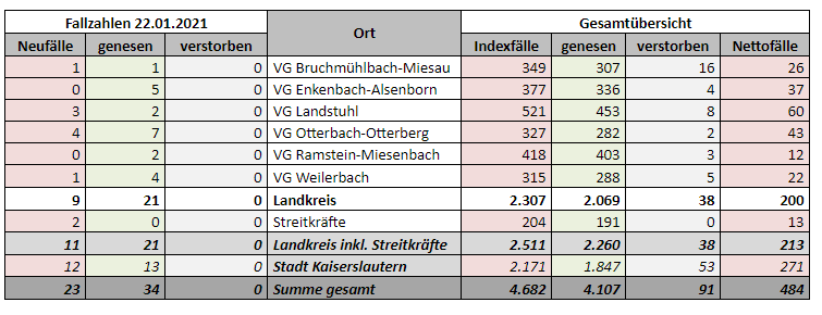 4.682 Indexfälle in Stadt und Landkreis, 4.107 genesenen Personen, 91 Todesfälle, 22.01.2021