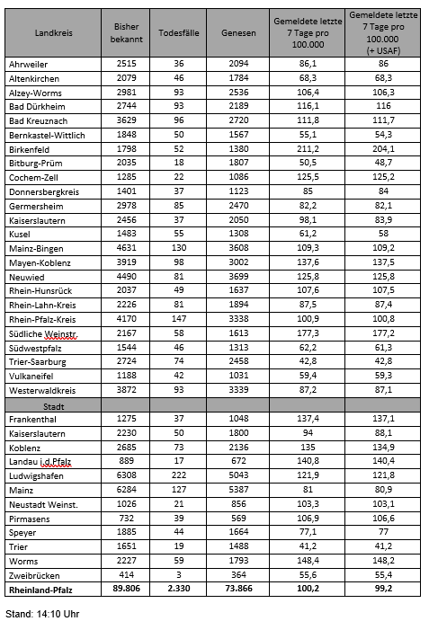 Die oben genannten Zahlen entsprechen den in der Meldesoftware des Robert Koch-Instituts übermittelten laborbestätigten Fällen einer COVID-19 Erkrankung mit Meldeadresse in Rheinland-Pfalz. Diese werden von den Gesundheitsämtern über die Landesmeldestelle beim Landesuntersuchungsamt an das Robert Koch-Institut übermittelt. Diese Zahlen können vereinzelt von den durch die Kreisverwaltungen kommunizierten Zahlen abweichen.