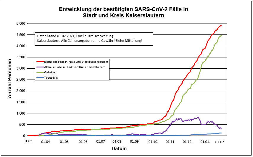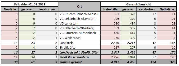 4.917 Indexfälle in Stadt und Landkreis, 4.468 genesenen Personen, 124 Todesfälle, 01.02.2021.