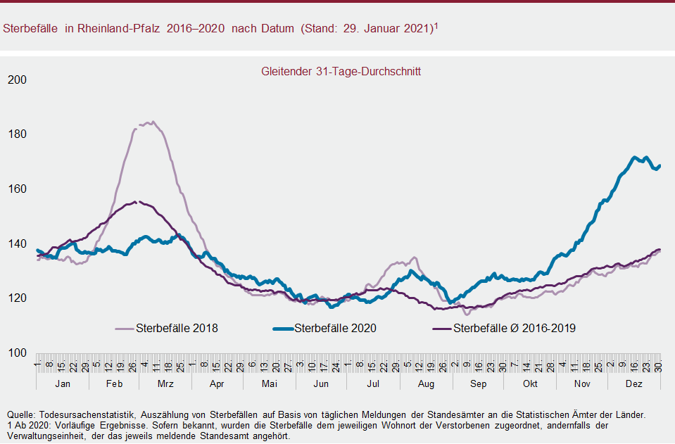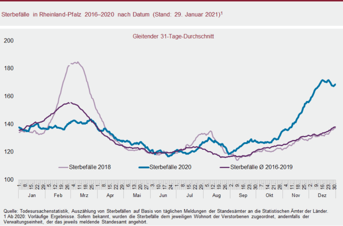 Für die Berechnungen wurden darüber hinaus die Ergebnisse der Statistik der Sterbefälle, der laufenden Bevölkerungsfortschreibung sowie Daten des Robert Koch-Instituts zu den bestätigten Todesfällen, die mit einer COVID-19-Erkrankung in Zusammenhang stehen, herangezogen. Weiterführende Informationen zur Entwicklung der Corona-Pandemie in Rheinland-Pfalz inklusive methodischer Hinweise zur Aussagekraft der verwendeten Daten sind unter https://www.statistik.rlp.de/de/corona/aktuelle-entwicklung/ verfügbar.