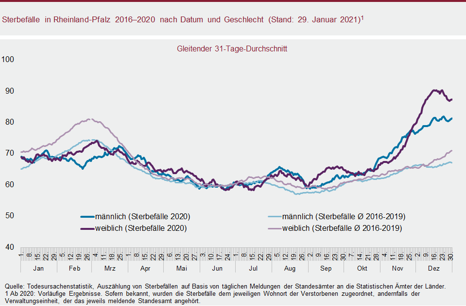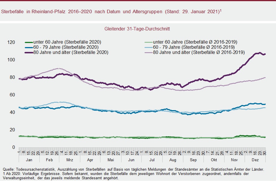 Neben dem Pandemiegeschehen hat die demografische Alterung, d. h. die zunehmende Zahl älterer und hochbetagter Menschen zu einem Anstieg der Sterbefälle beigetragen. Der Befund einer erhöhten Sterblichkeit bleibt allerdings auch dann bestehen, wenn die Veränderung der Bevölkerungszahl und der Wandel in der Altersstruktur der Bevölkerung berücksichtigt werden. Das gilt vor allem für den Dezember 2020, in dem mit 5.325 Rheinland-Pfälzerinnen und Rheinland-Pfälzern mehr Personen verstarben als in jedem anderen Monat seit Beginn der elektronischen Datenerfassung der Sterbefallzahlen im Statistischen Landesamt.