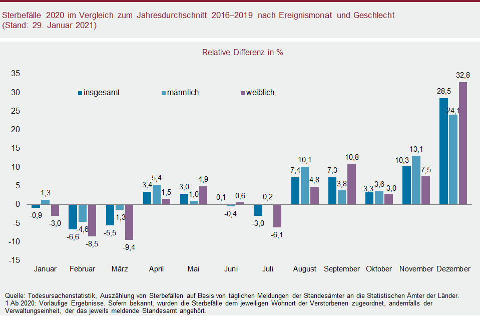 Insgesamt fiel die Zahl der Sterbefälle 2020 in vier der zwölf Kalendermonate niedriger aus als im Mittel der Jahre 2016 bis 2019. Das gilt für die ersten drei Monate des Jahres, die von einem vergleichsweise milden Winter geprägt waren und in denen die Corona-Pandemie noch keine wesentlichen Auswirkungen auf die Entwicklung der Sterbefälle zeigte. Das gilt außerdem für den Sommermonat Juli (minus 3 Prozent), der relativ mild ausfiel, und deshalb vergleichsweise wenige Todesfälle auf hohe Temperaturen zurückzuführen sein dürften.